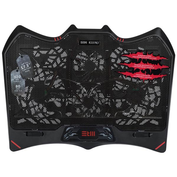 Для моделей с диагональю экрана: до 17.3", Кол-во вентиляторов: 4, Скорость вентилятора: 1500 об/мин, Подсветка вентилятора: Да, Регулировка угла уст. ноутбука: Да, Питание от USB порта: Да