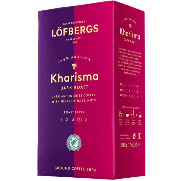 Страна: Швеция, Серия: Löfbergs Kharisma молотый 500g, Арабика: 100 %, Степень обжарки кофе: 4, Клапан дегазации: Да, Вес: 500 г