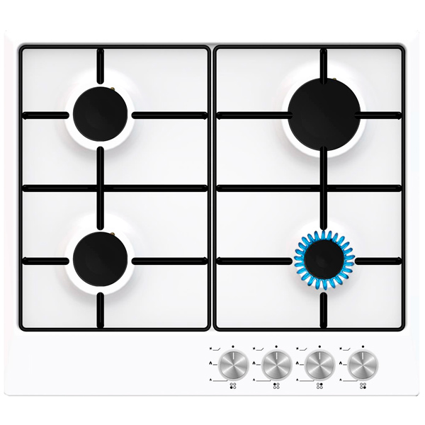 Размер ниши (Ш*Г): 560*490 мм, Электроподжиг конфорок: автоматический, Количество конфорок: 4, Газконтроль конфорок: Да, Минимальный огонь: Да, Размещение панели управления: спереди/справа, Материал варочной поверхности: металл, Решетка: эмалированная, Цвет: белый