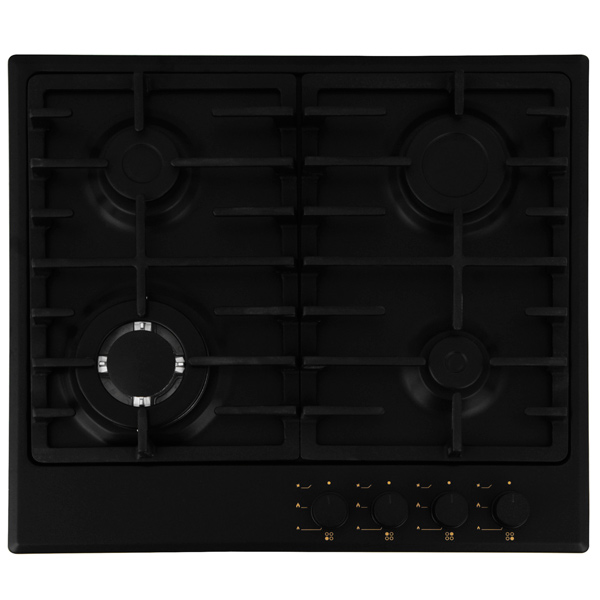 Размер ниши (Ш*Г): 560*490 мм, Электроподжиг конфорок: автоматический, Количество конфорок: 4, Газконтроль конфорок: Да, Минимальный огонь: Да, Размещение панели управления: спереди/справа, Материал варочной поверхности: металл, Решетка: чугунная, Цвет: черный