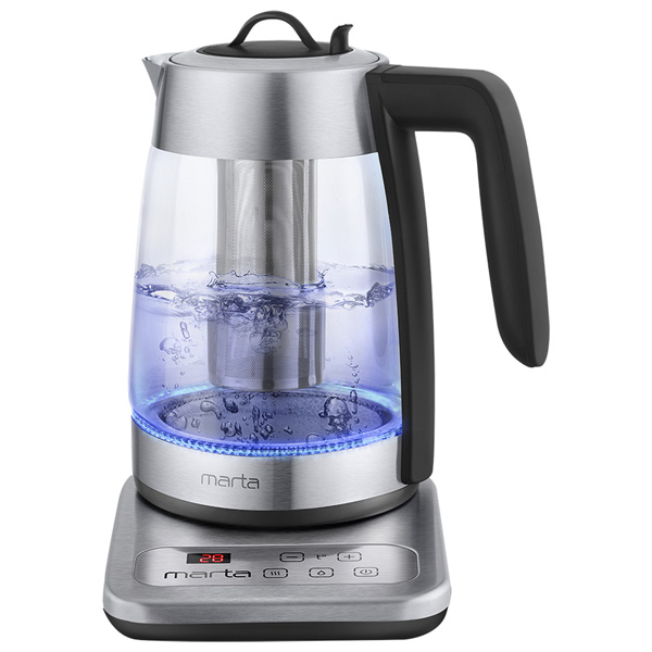Максимальный объём: 1.8 л, Потребляемая мощность: 2200 Вт, Диапазон температур: 40-100 *С, Материал корпуса: стекло, Тип нагревательного элемента: закрытая спираль, Подсветка: Да, Фильтр от накипи: Да, Поддержание температуры: Да, Отключение при отсутствии воды: Да, Тип управления: электронный, Вес: 1.2 кг
