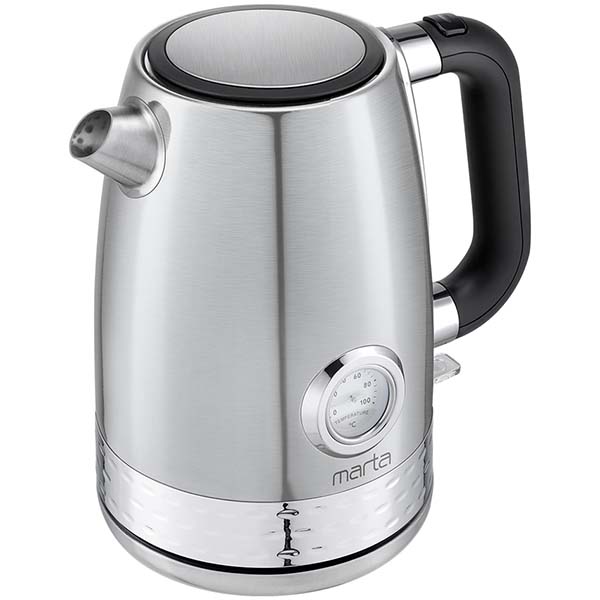 Максимальный объём: 1.8 л, Потребляемая мощность: 2200 Вт, Диапазон температур: 100 *С, Материал корпуса: нержавеющая сталь, Тип нагревательного элемента: диск, Отключение при отсутствии воды: Да, Тип управления: механический, Вес: 1.11 кг