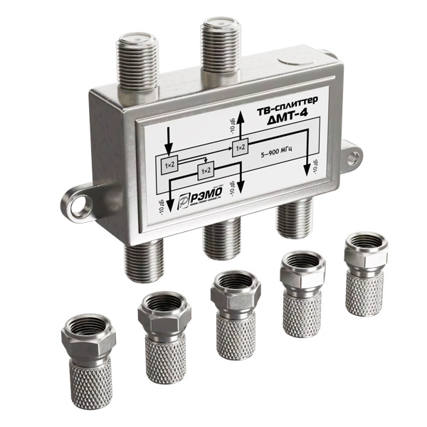 Тип разъемов: 1 вх. "мама"/ 4 вых. "мама" (F-con.), Покрытие разъемов: никель, Разветвитель TV антенны: для 4-х устр., Частотный диапазон: 5 - 900 Гц