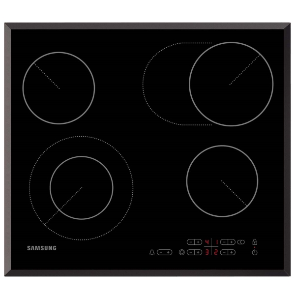 Размер ниши (Ш*Г): 560*490 мм, Количество конфорок: 4, Тип конфорок: Hi-Light/Radiant, Расширение зоны нагрева конфорок: на 2-х конф., Защита от детей: Да, Быстрый нагрев: Да, Индикация выбранной мощности: Да, Цвет: черный