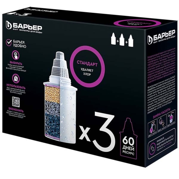 Картриджей в комплекте: 3 шт, Для фильтров: кувшинов БАРЬЕР, Ресурс картриджа очистки воды: 350 л